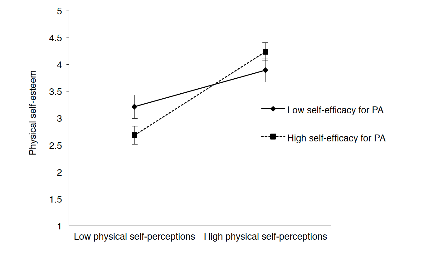 Results: Moderate levels of physical and global self-esteem were reported. Both types of self-esteem were significantly related to physical self-perceptions, but not to PA behaviour nor self-efficacy for PA. Self-efficacy for PA moderated the relationship between physical self-perceptions and physical self-esteem, such that the association between physical self-perceptions and physical self-esteem was of stronger magnitude at higher levels of self-efficacy for PA than at lower levels of self-efficacy for PA.