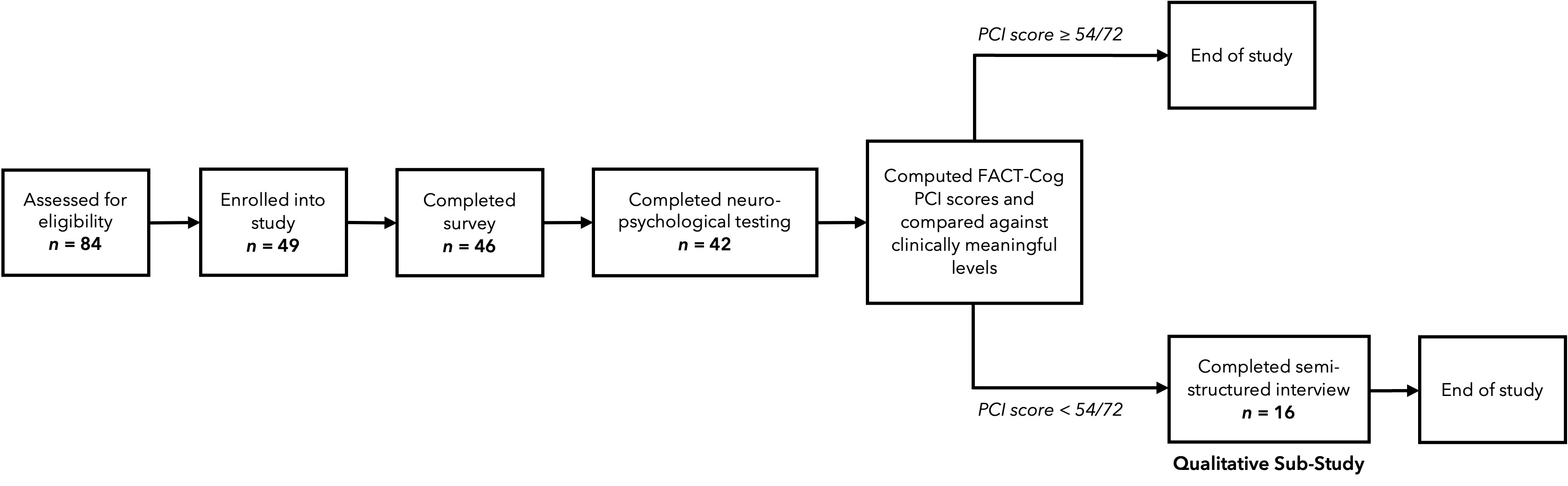 Results: Most (60.9%) self-reported clinically meaningful CRCI and displayed poorer executive functioning and processing speed (but not working memory) than normative data. Disease-related factors, psychological factors, and PA had null-to-moderate (rs = −0.32–0.28), small-to-large (rs = −0.74–0.77), and trivial-to-moderate (rs = −0.16 – 0.36) correlations with cognition (respectively), with differences in magnitude between self-reported and objective cognition.